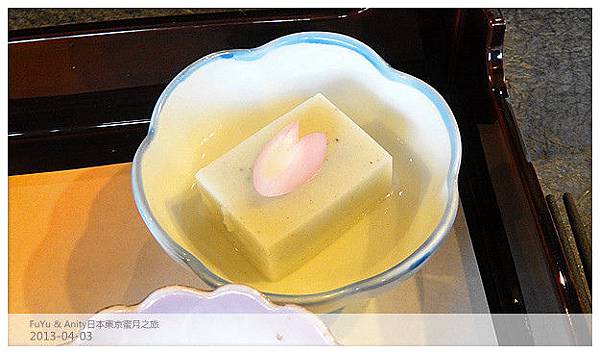 豆腐上方放置一片花瓣,看起來美麗而浪漫。