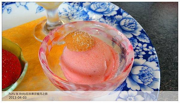 草莓冰淇淋,上方放了一小片餅乾,再撒上糖衣,