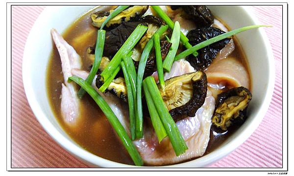 2.北菇泡水至軟,去蒂切半;蔥切段;薑切片。