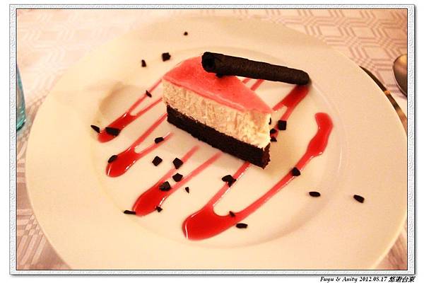 上層是草莓醬,中層是香草慕斯、下層是巧克力海綿蛋糕,